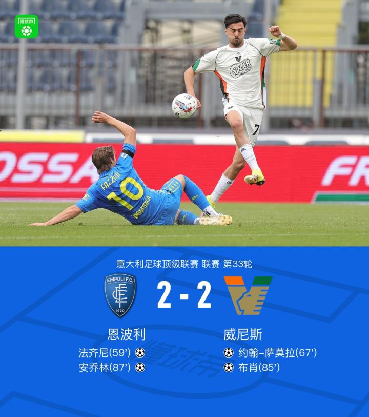 恩波利2-2威尼斯,法齐尼安乔林建功 共决胜